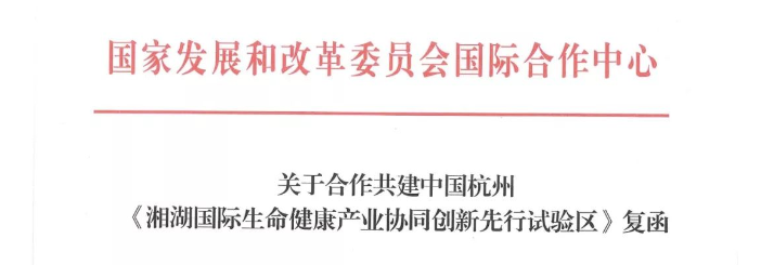 國家發改委國際合作中心正式下達中國杭州《湘湖國際生命健康產業協同創新先行試驗區》的復函
